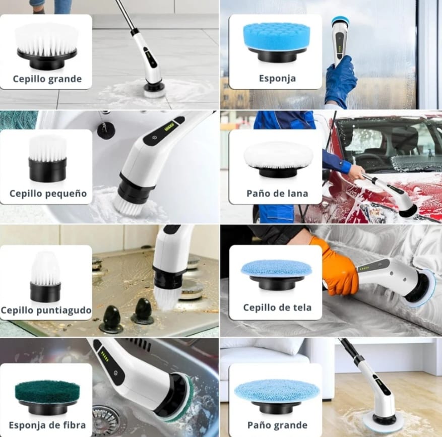 👉 Con 8 cabezales giratorios intercambiables podrás limpiar baños, cocinas, azulejos, vidrios, estufas y más… sin esfuerzo.